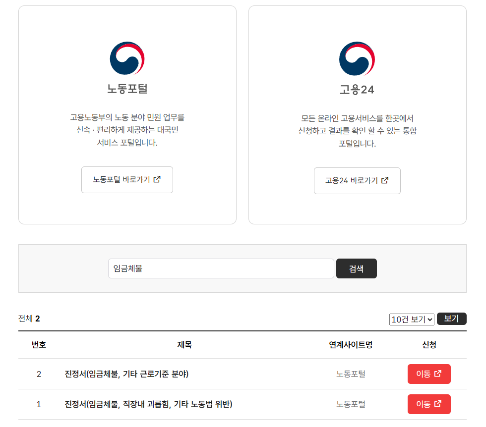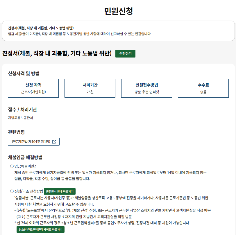 ⭕ 고용노동부 홈페이지 → ‘민원 신청’ → ‘임금체불 진정’ 선택
