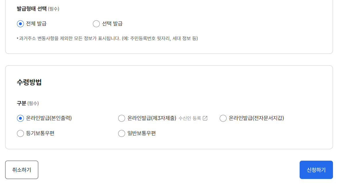 용도: ‘행정기관 제출용’ 또는 ‘개인확인용’ 등 선택