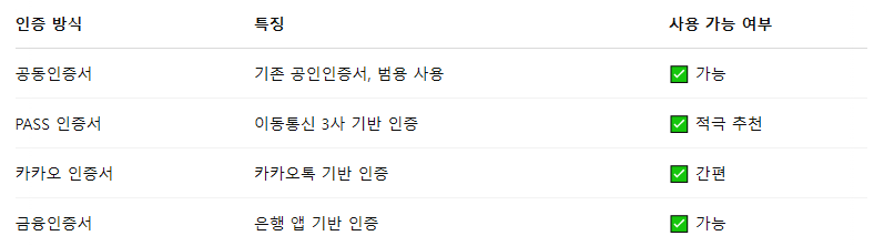 📍 공동인증서 또는 간편인증 수단 (PASS, 카카오, 금융인증서 등)