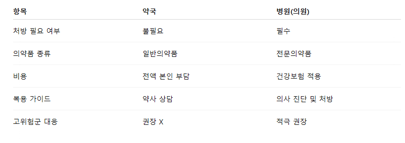 ☑️ 약사의 상담에 의존하되, 증상이 심하거나 고위험군(고령자, 기저질환자)인 경우 병원 진료 권장
