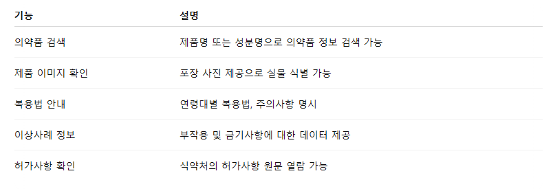 사용자는 이 포털을 통해 약물 성분, 효능, 용법·용량, 주의사항, 제조사 정보 등을 한눈에 확인할 수 있으며, 병원 처방약부터 일반약, 건강기능성 원료까지 전반적인 의약품 정보를 얻을 수 있습니다.