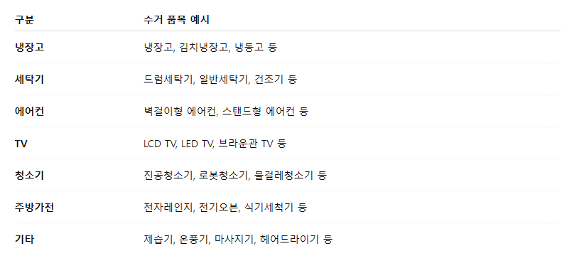 또한, 설치형 제품(예: 벽걸이형 에어컨)은 수거 전에 철거가 필요합니다.
