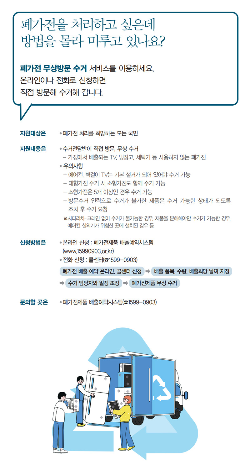 이제 더 이상 방치된 가전제품을 고민할 필요 없이, 환경부의 폐가전 무상 수거 서비스를 적극 활용하세요.