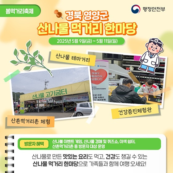 산나물의 고장 영양군에서 열리는 축제로, 건강한 봄철 먹거리를 주제로 다양한 요리를 즐길 수 있습니다.