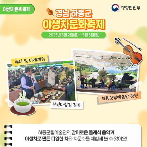 하동군립예술단의 감미로운 클래식 음악과 야생차로 만든 다양한 차와 차문화를 체험해 볼 수 있어요!