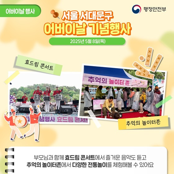부모님과 함께하는 소중한 추억을 만들 수 있는 행사로, 효드림 콘서트, 전통놀이 체험, 추억의 놀이터존 등 다양한 프로그램이 마련되어 있습니다.