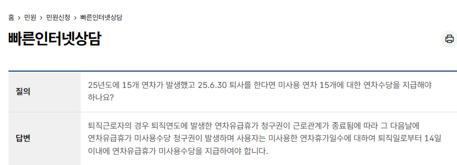 입사 후 1년이 지나 발생한 15일의 연차가 2024년 12월 31일까지 사용되지 않은 경우, 2025년 1월 1일 소멸