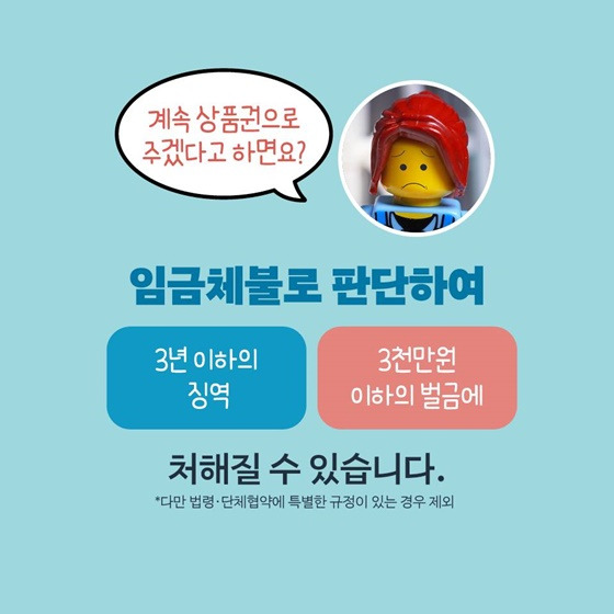 임금을 상품권으로 계속 지급하는 경우 ‘임금 체불’로 간주될 수 있으며, 3년 이하 징역 또는 3천만 원 이하 벌금의 처벌 대상입니다.