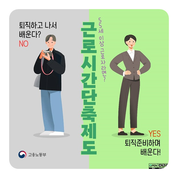 즉, 기존 정규직으로 일하고 있던 55세 이상 근로자가, 퇴직을 앞두고 자신의 일정을 일부 조절하면서 새로운 인생 계획을 세울 수 있도록 설계된 정책입니다.