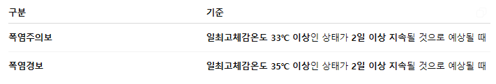 폭염 특보는 크게 ‘주의보’와 ‘경보’로 나뉘며, 그 기준은 다음과 같습니다.