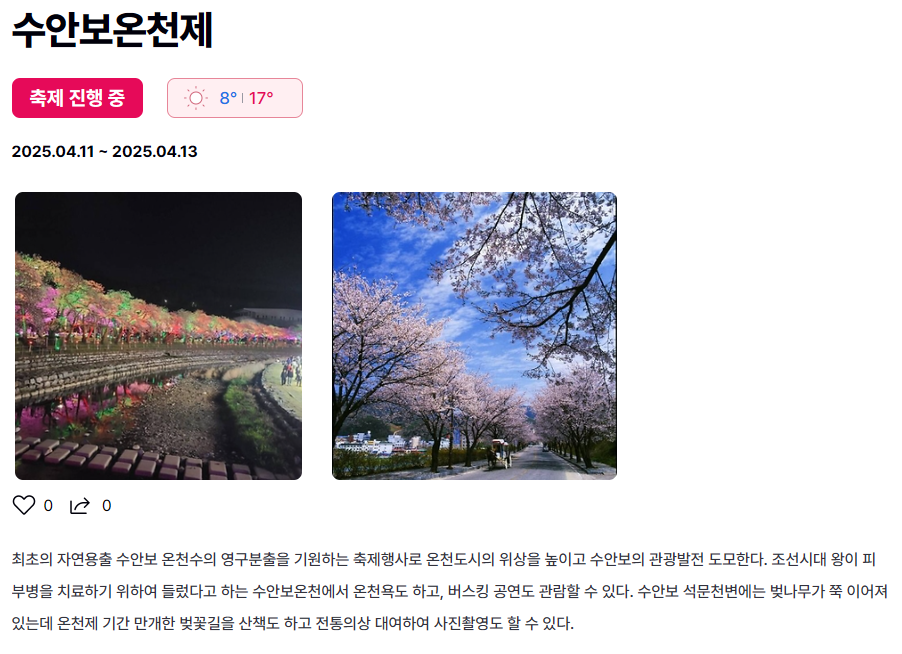 2025년에는 4월 11일부터 13일까지 3일간 ‘수안보 온천제’가 개최되어, 봄꽃과 온천이 어우러지는 지역축제로서 방문객을 맞이합니다.
