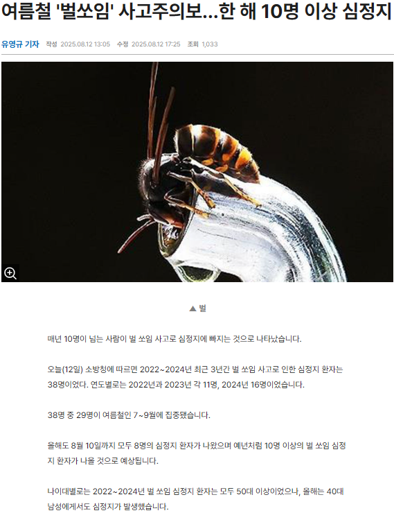 벌쏘임은 단순한 여름철 불편이 아니라, 실제로 생명까지 위협할 수 있는 심각한 사고입니다.