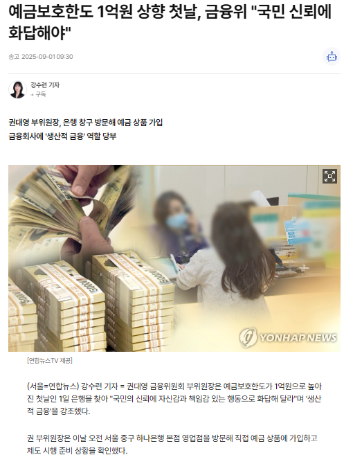 2025년 9월 1일부터 예금보호한도 상향 적용