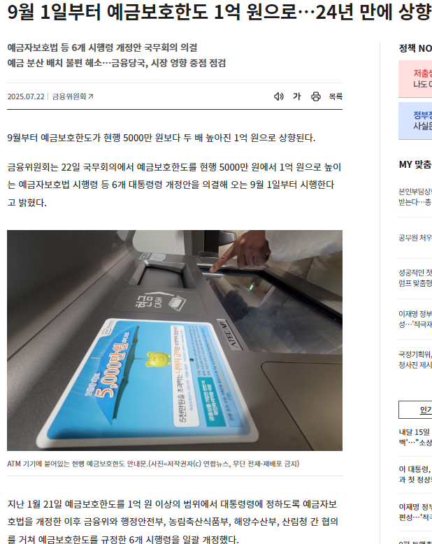 2025년 9월 1일부터 국내 금융시장에서 예금자 보호 한도가 5000만 원에서 1억 원으로 두 배 상향됩니다.